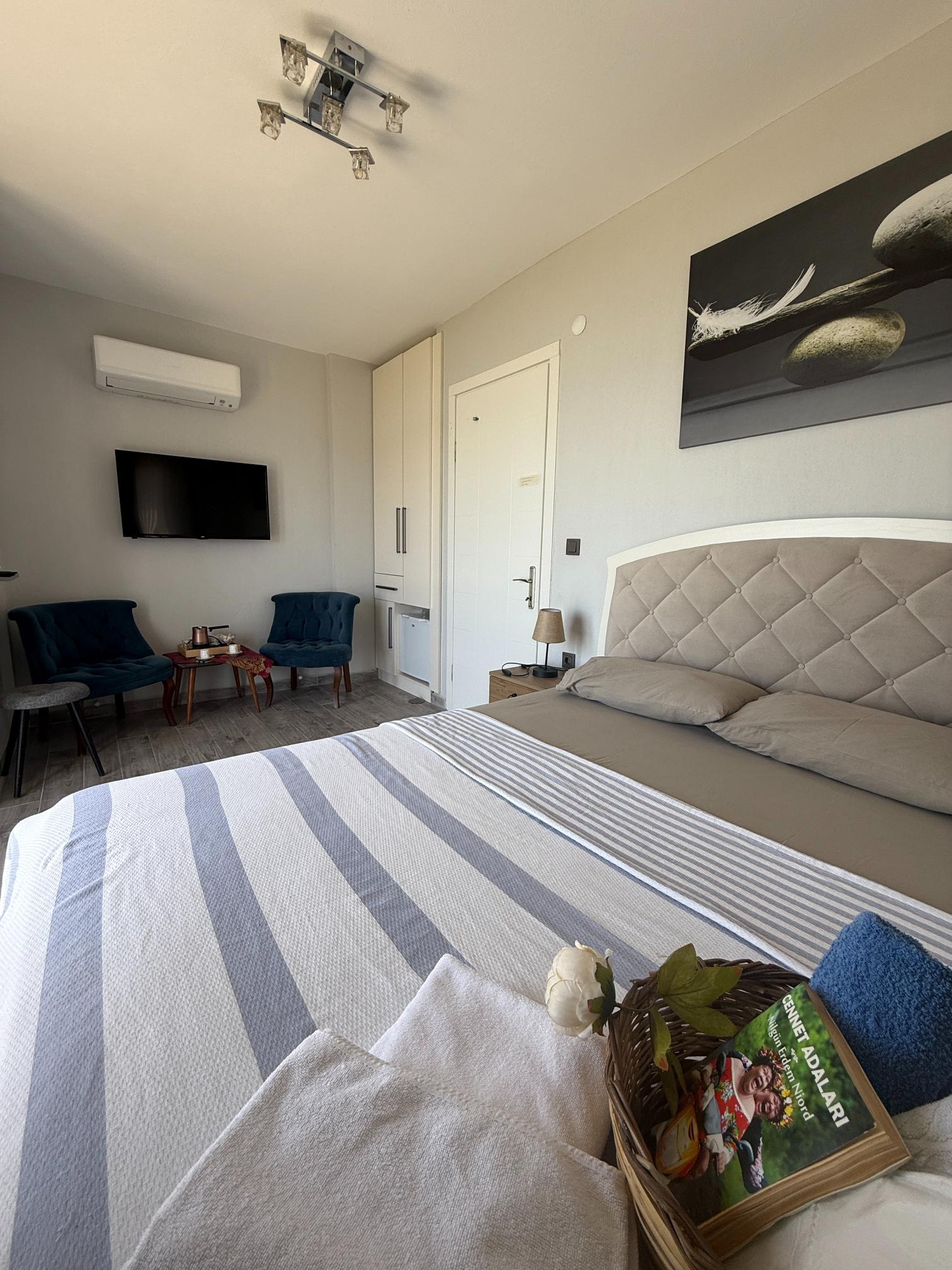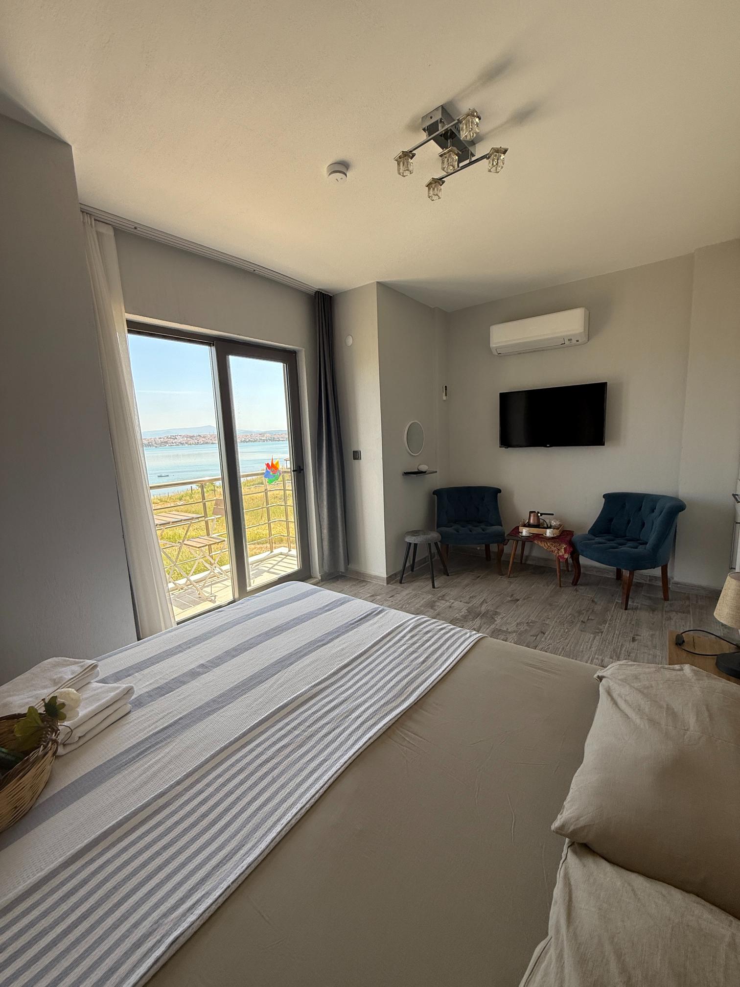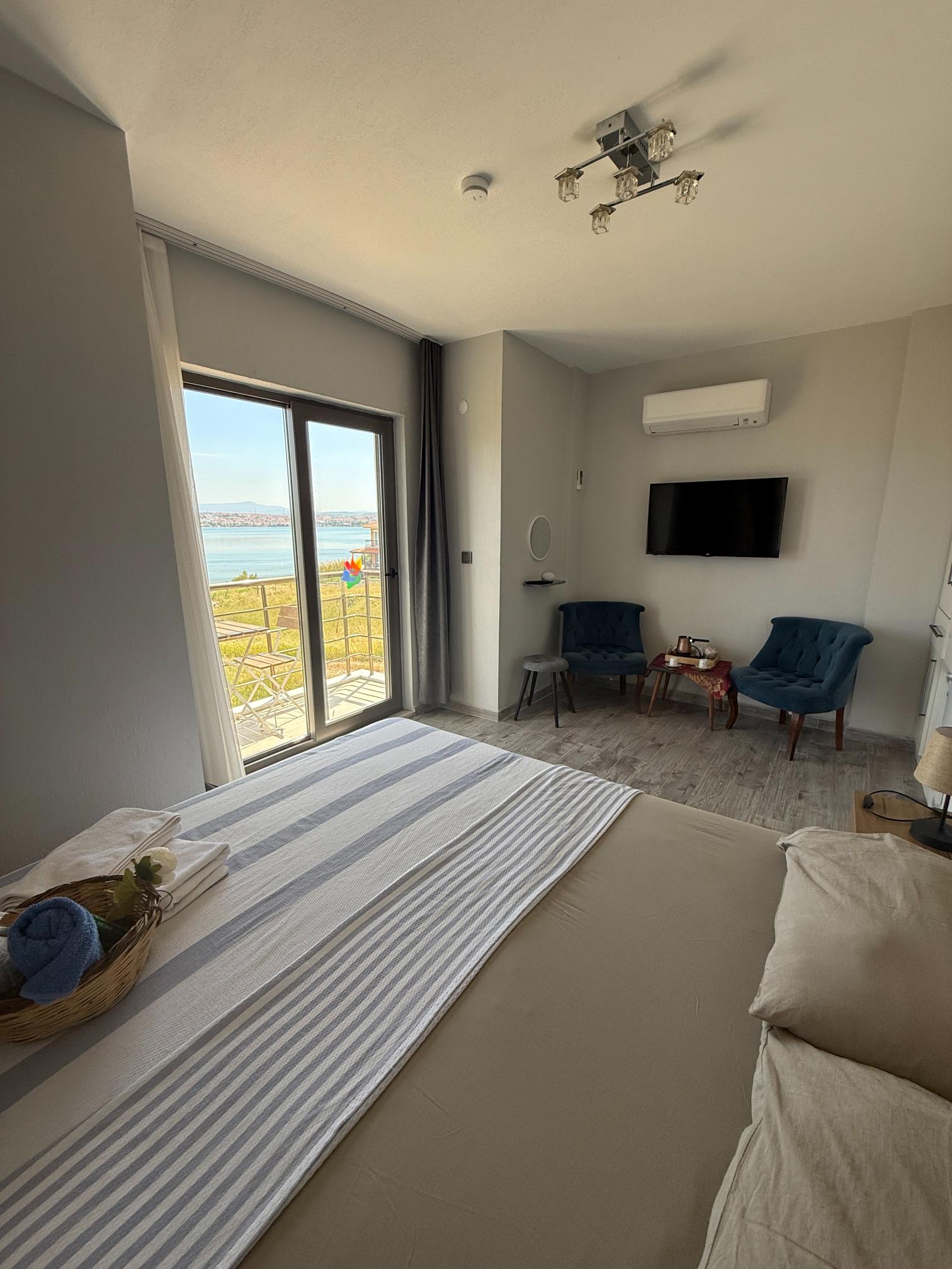 This unique 2-level listing combines the spacious sea-view studio with the top-floor 2-bedroom flat, creating a comfortable home for up to 7 guests. With 3 bedrooms, 2 bathrooms, balconies overlooking the sea, and private entrances to each level, it’s ideal for large families or friends seeking comfort and flexibility in beautiful Cunda.