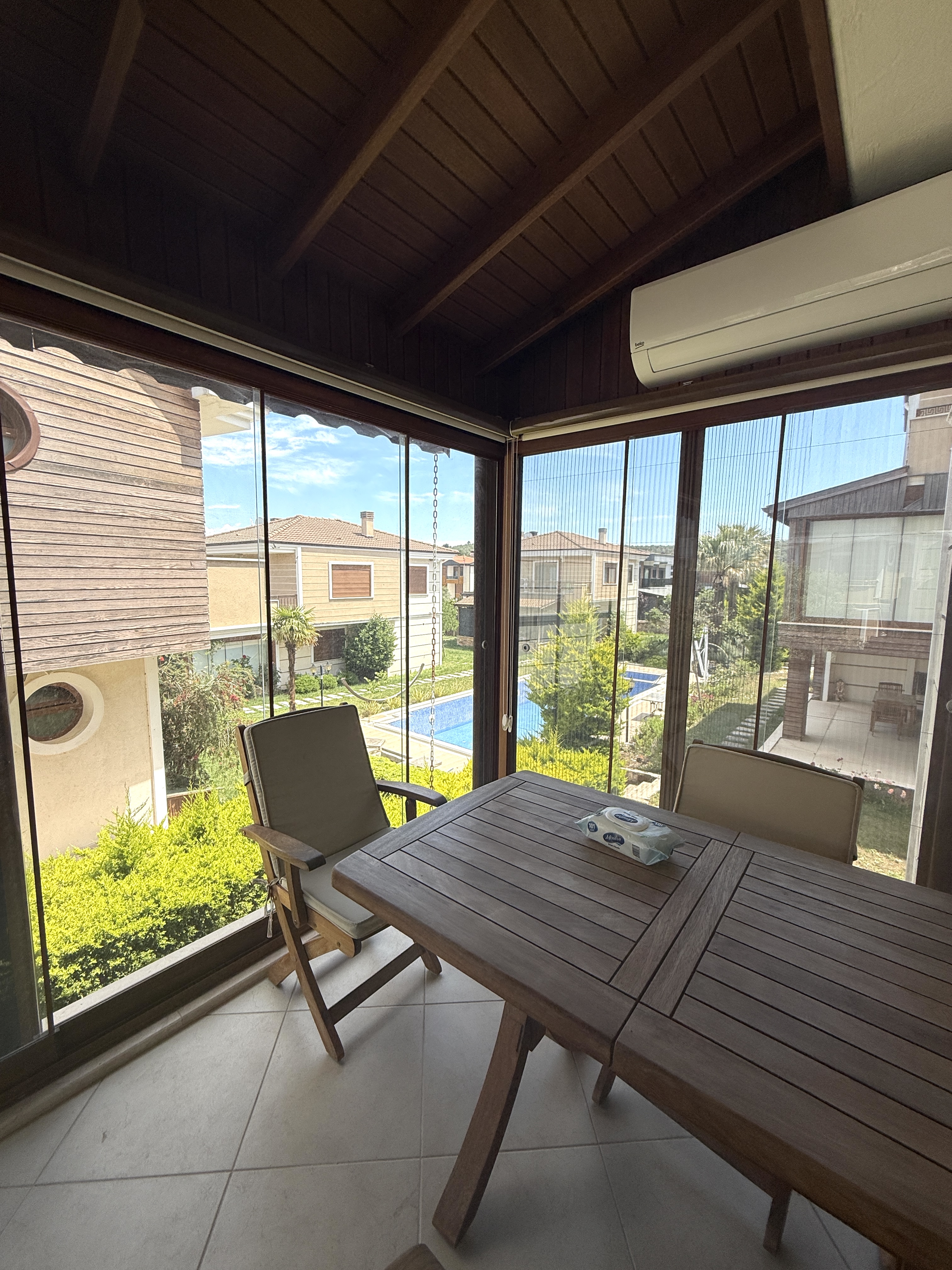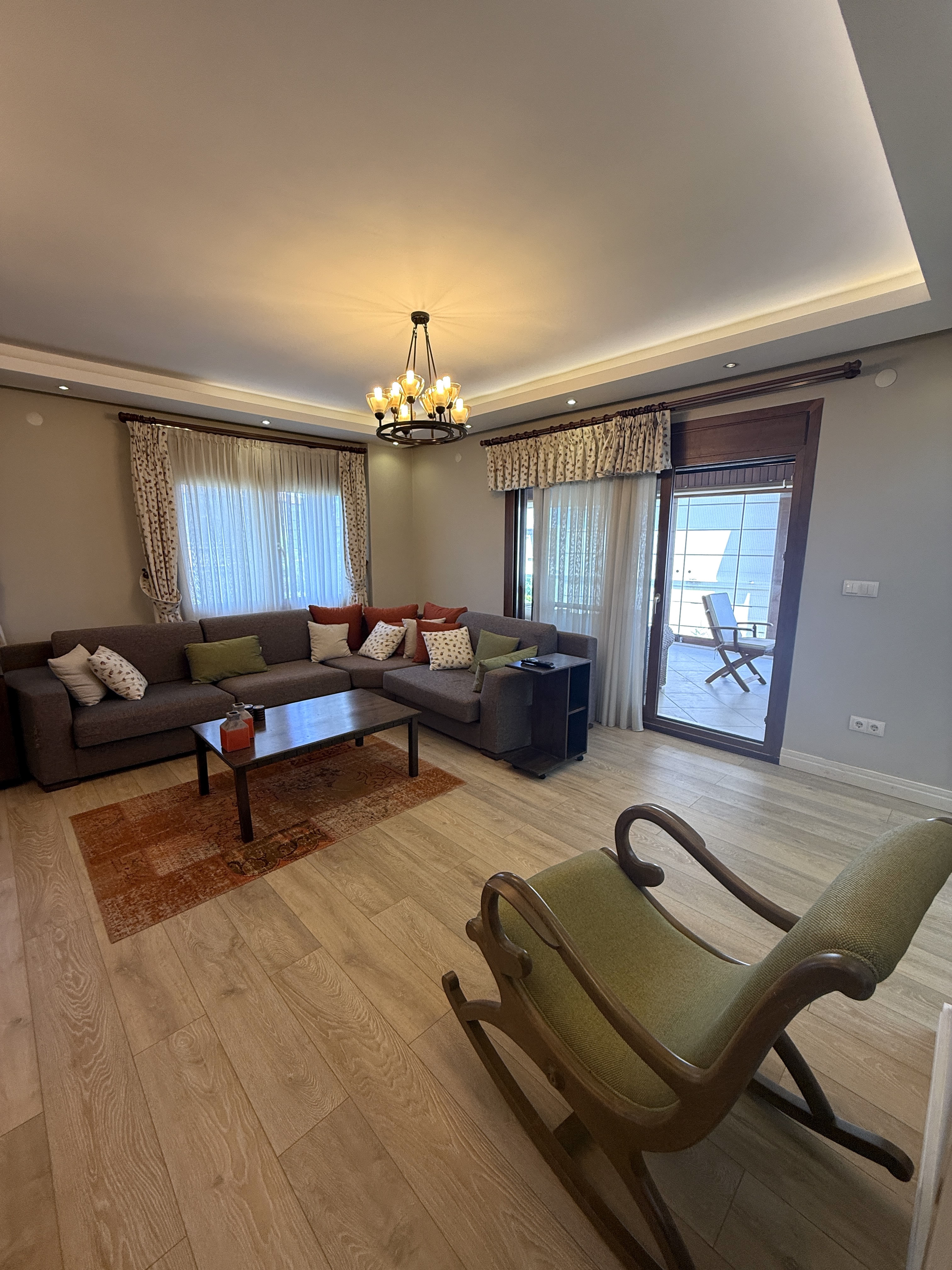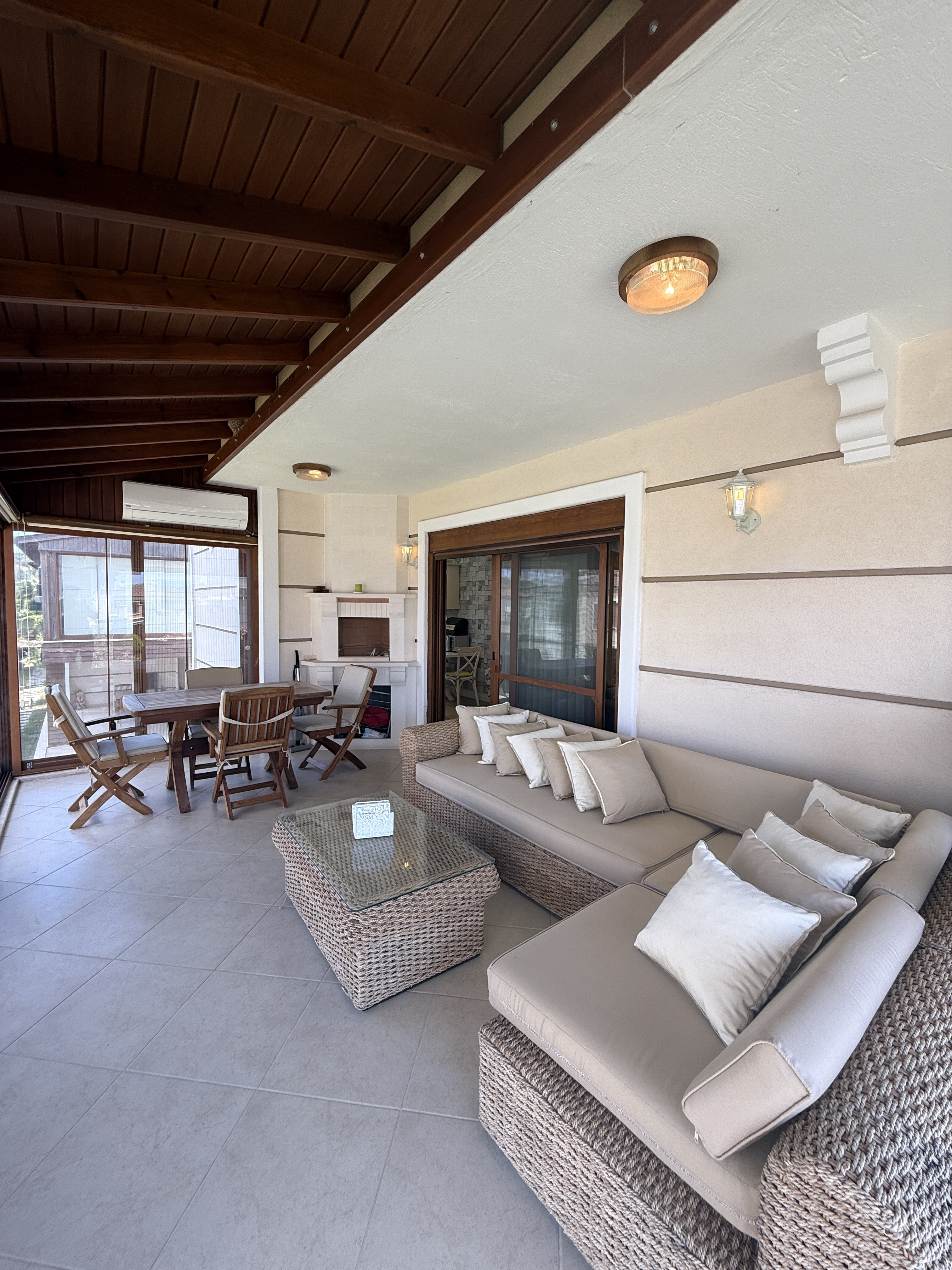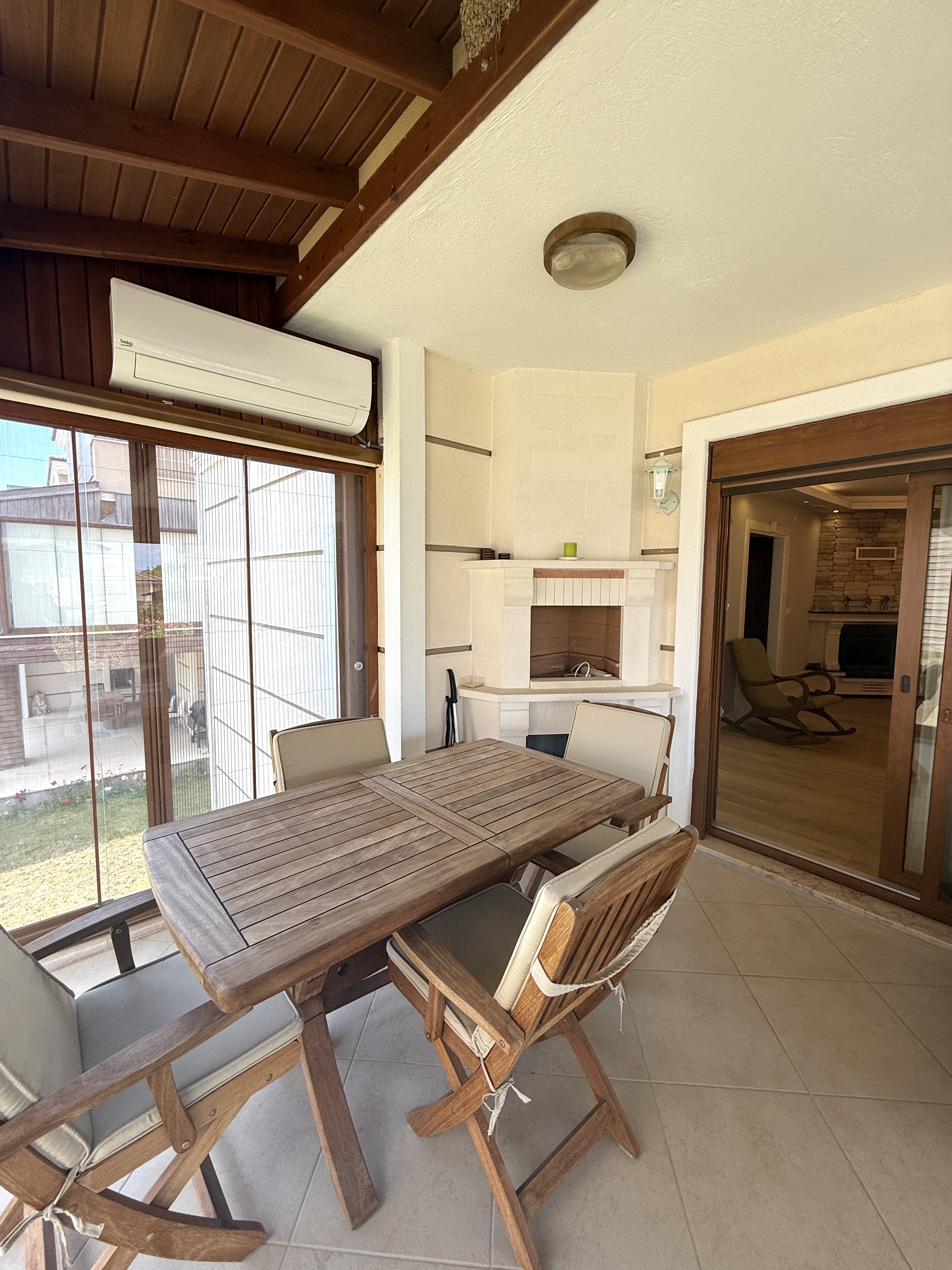 Located in a boutique site with a shared pool, this stylish 3-story villa in Şirinkent area offers a private garden, multiple terraces, and beach access just 400m away. The villa features a cozy garden-level living area with an island kitchen, a large main lounge with a second kitchen and a winter garden overlooking the pool, 3 bedrooms, 3 bathrooms, a small lounge with a sofa bed, accommodating up to 9 guests comfortably (The shared pool will be open and available starting from June 15th).