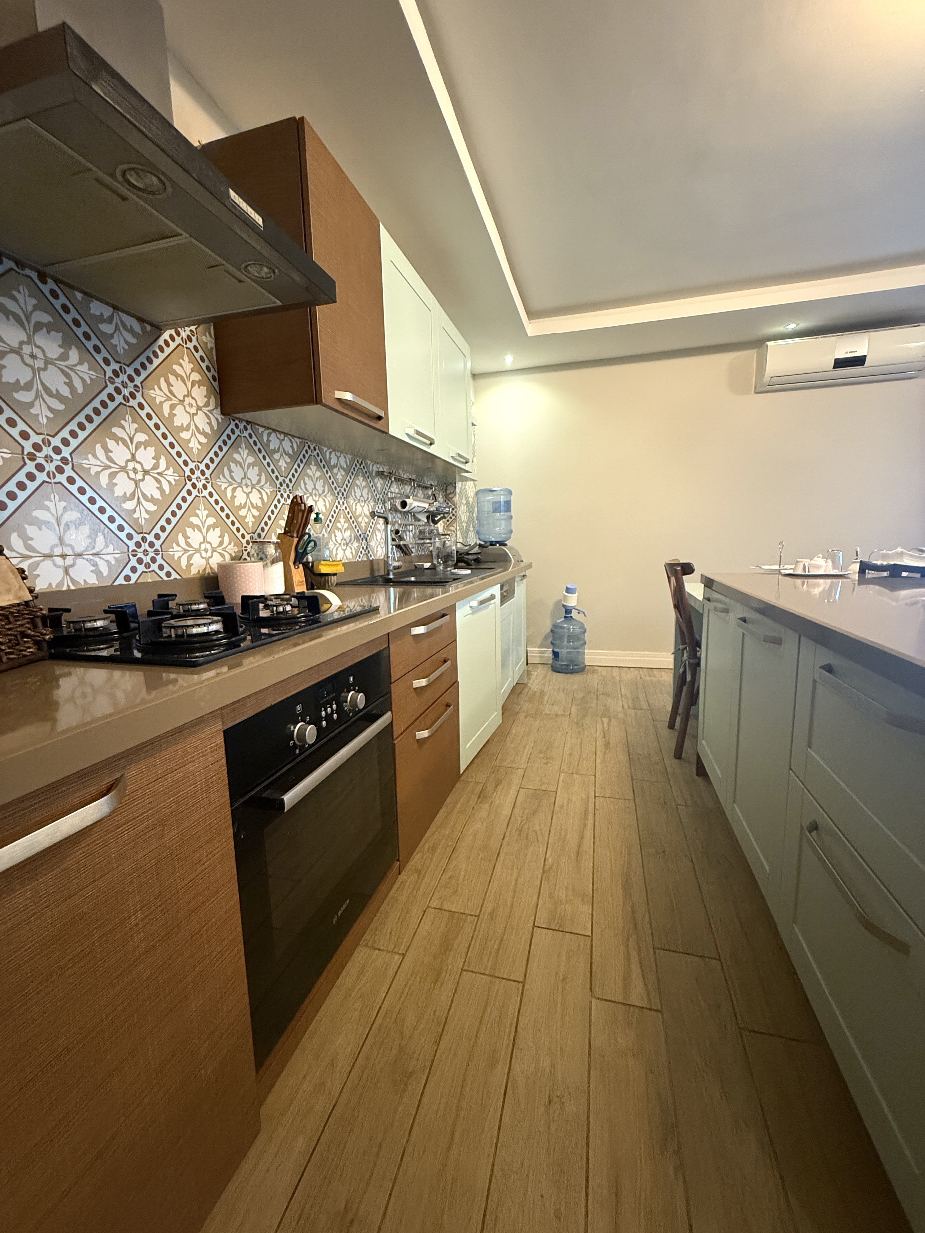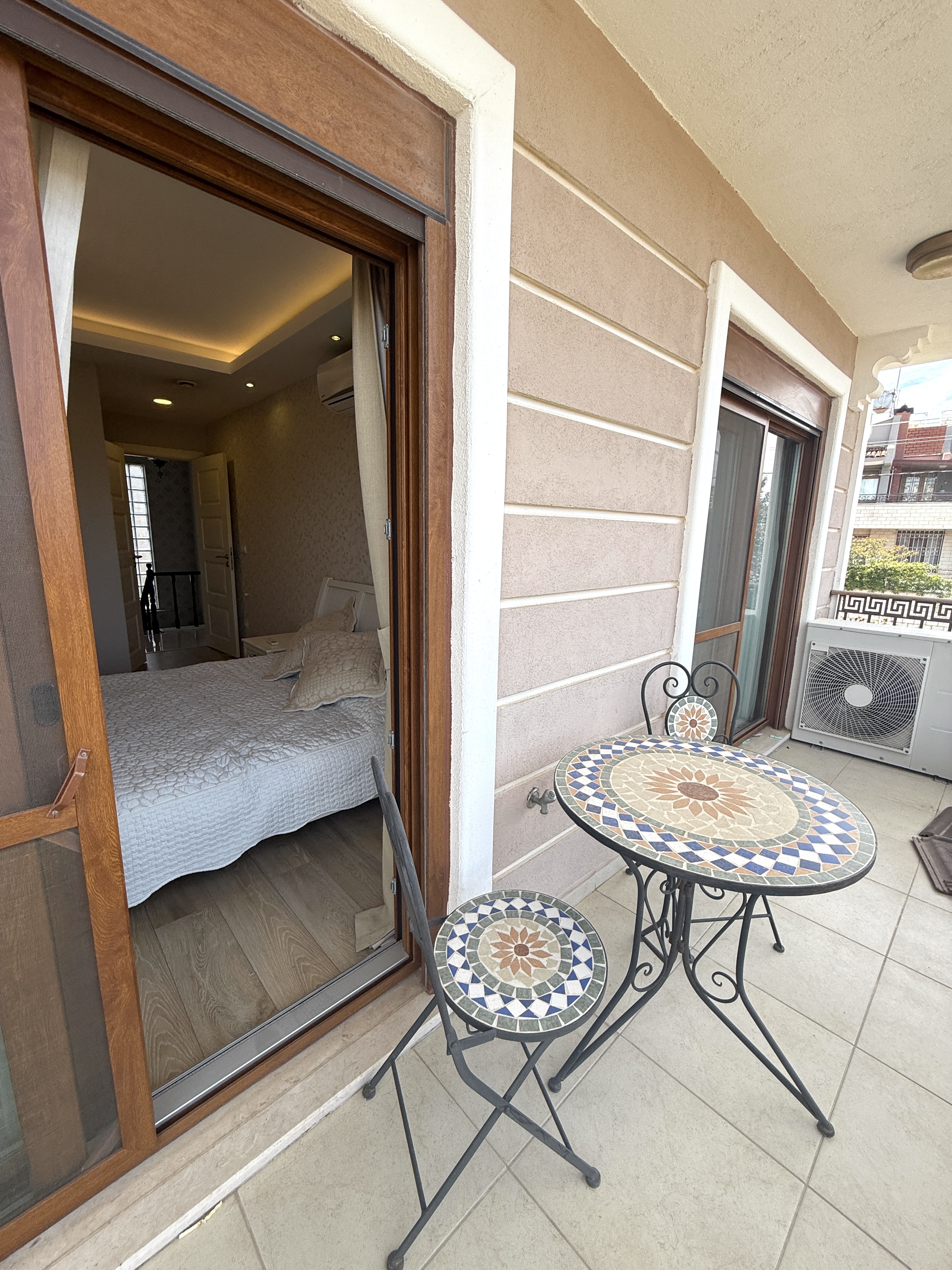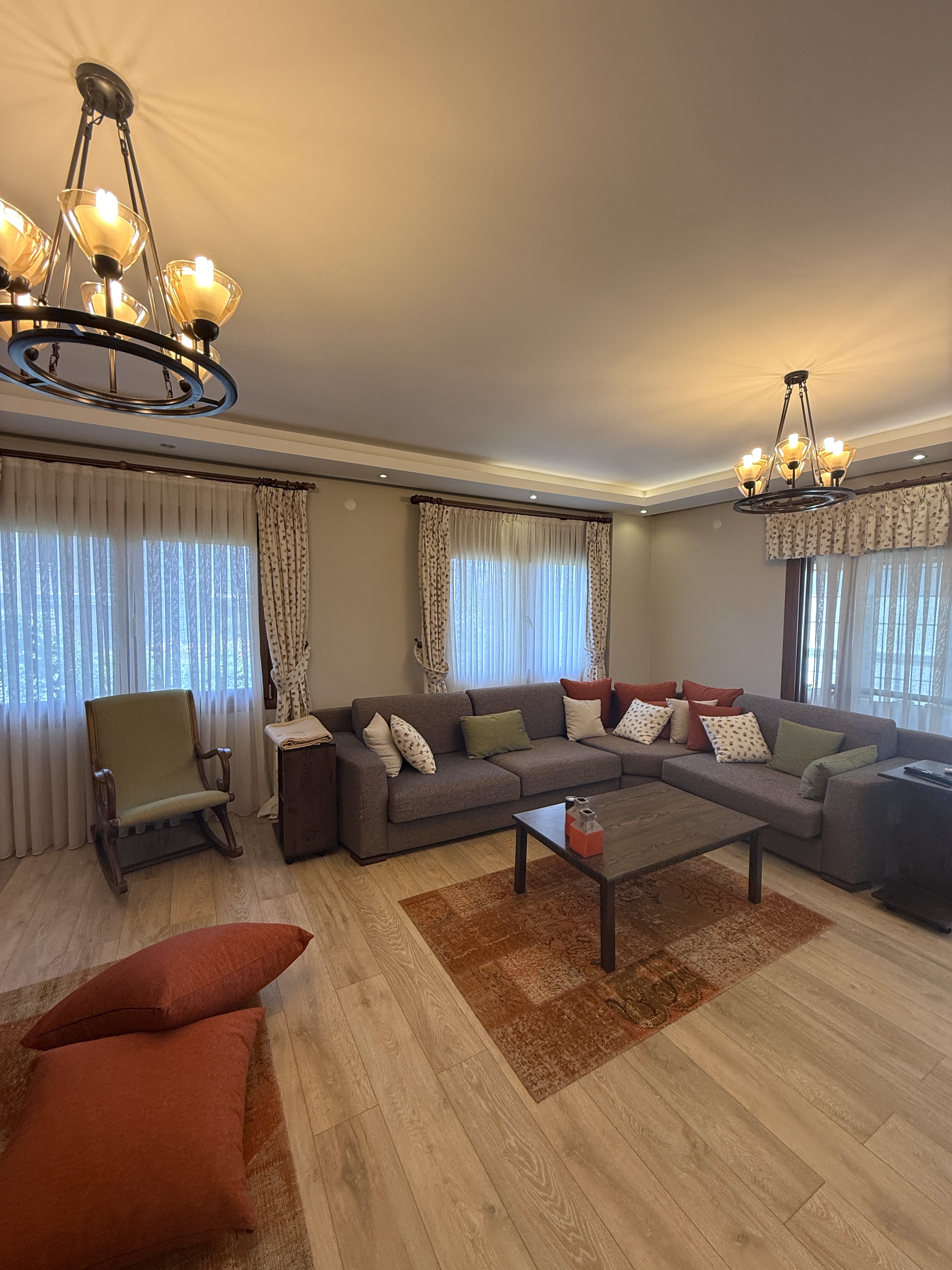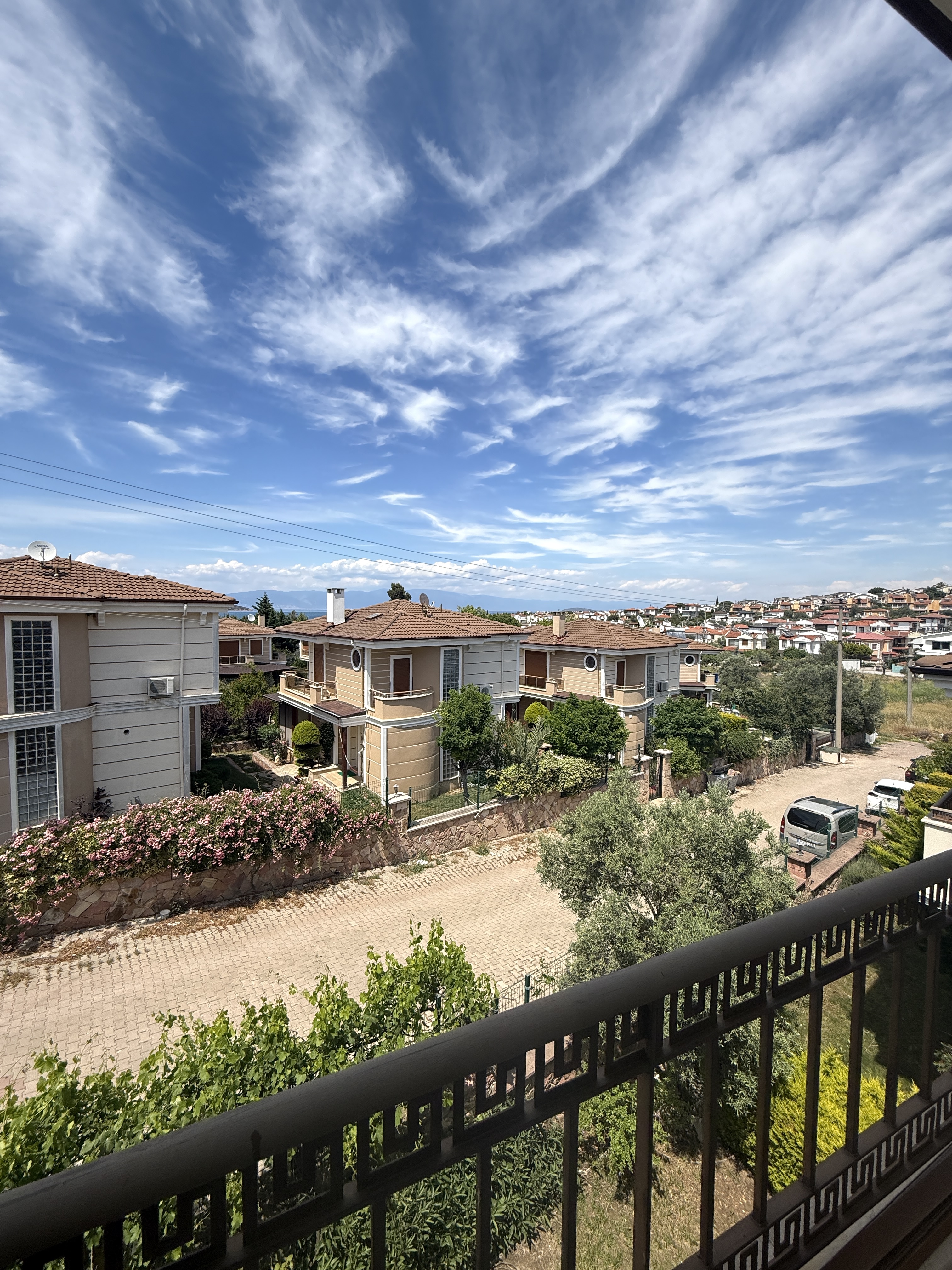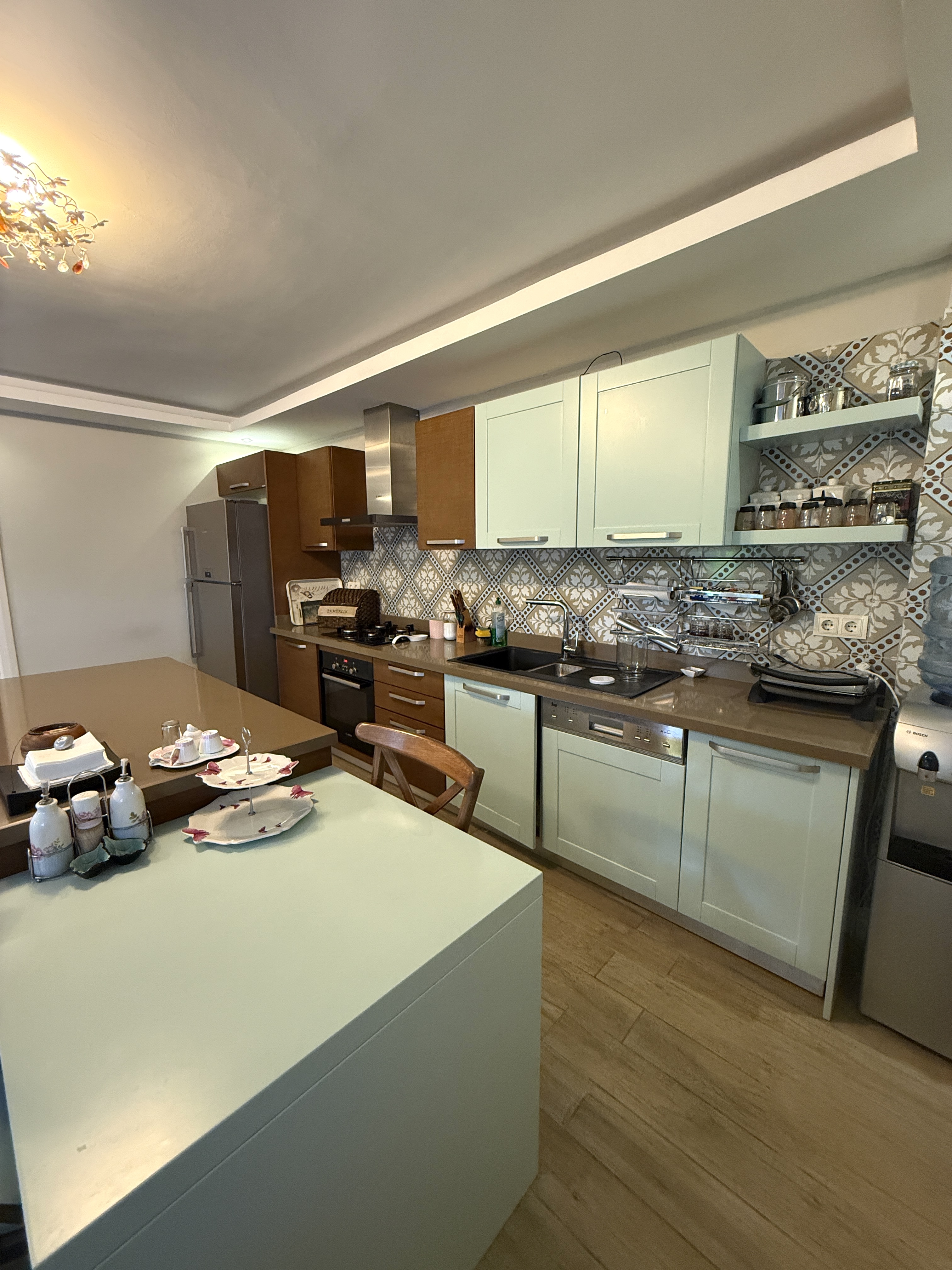 Located in a boutique site with a shared pool, this stylish 3-story villa in Şirinkent area offers a private garden, multiple terraces, and beach access just 400m away. The villa features a cozy garden-level living area with an island kitchen, a large main lounge with a second kitchen and a winter garden overlooking the pool, 3 bedrooms, 3 bathrooms, a small lounge with a sofa bed, accommodating up to 9 guests comfortably (The shared pool will be open and available starting from June 15th).