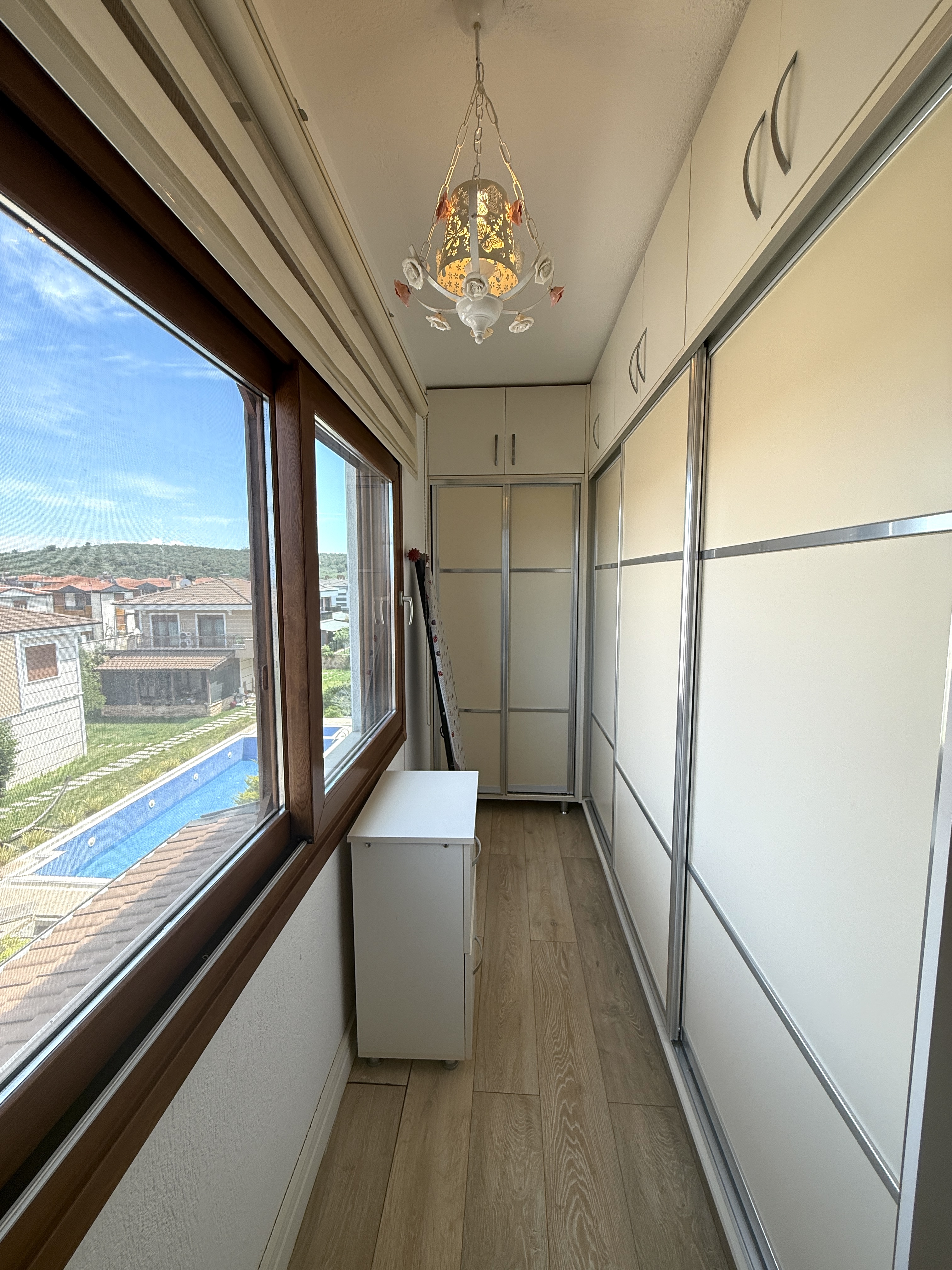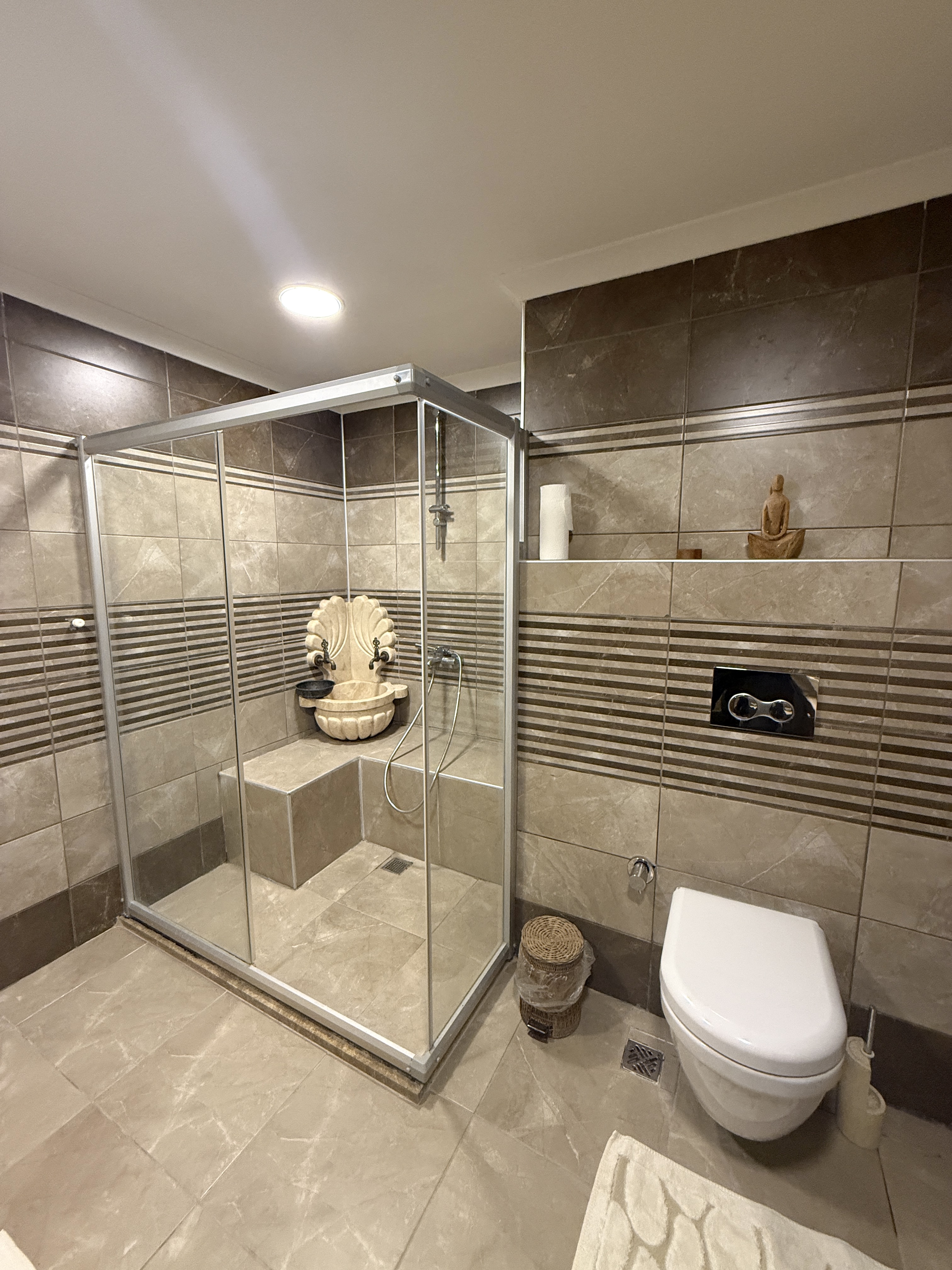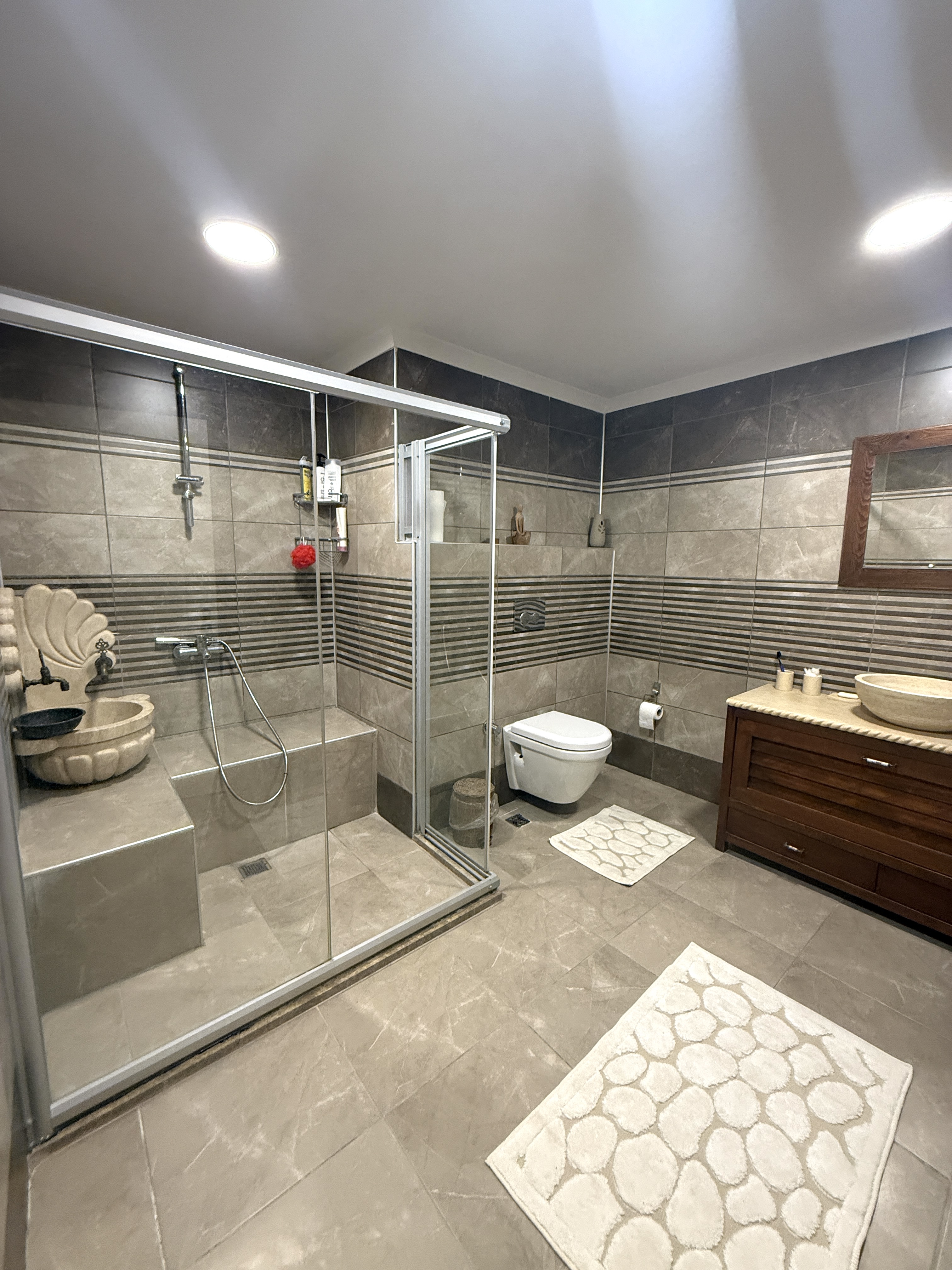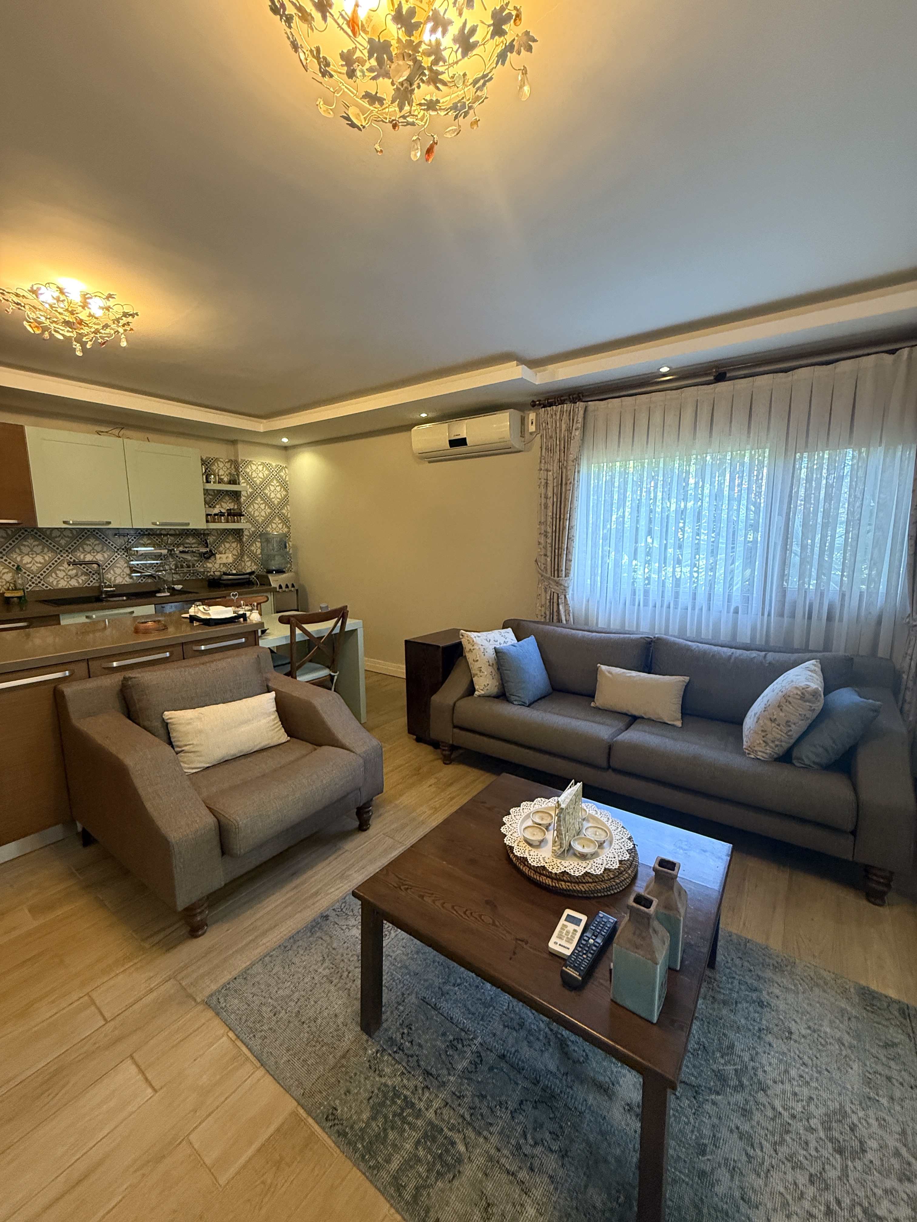 Located in a boutique site with a shared pool, this stylish 3-story villa in Şirinkent area offers a private garden, multiple terraces, and beach access just 400m away. The villa features a cozy garden-level living area with an island kitchen, a large main lounge with a second kitchen and a winter garden overlooking the pool, 3 bedrooms, 3 bathrooms, a small lounge with a sofa bed, accommodating up to 9 guests comfortably (The shared pool will be open and available starting from June 15th).